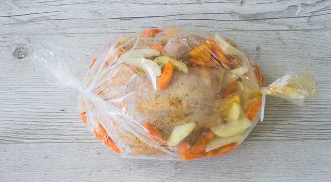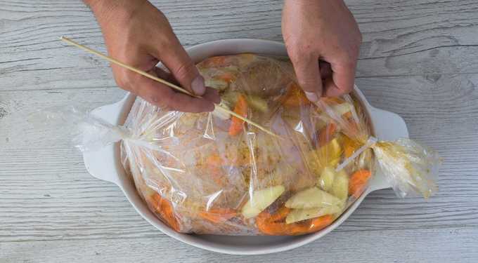 - Maak met een tandenstoker kleine gaatjes in de mouw. Daarna sturen we het gerecht 1,5 uur naar de oven. Wij bakken op een temperatuur van 180 graden.