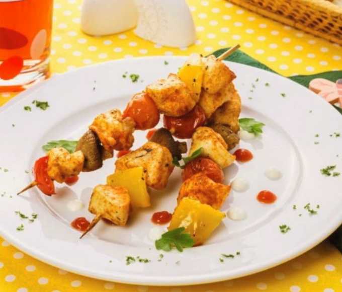 - We rijgen producten aan spiesjes en wisselen ze met elkaar af. Daarna sturen we het gerecht 20 minuten naar de oven. Bak op 180 graden, draai af en toe.