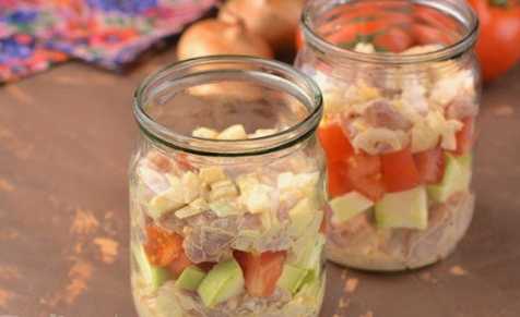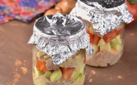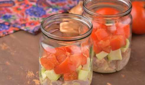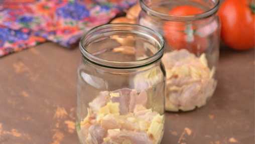 - Leg een laagje ingelegde kip op de bodem van de potten van een liter.