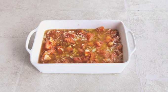 - Doe de rijst in een ovenschaal bedekt met plantaardige olie en gehakte tomaten, uien en teentjes knoflook. Vul de inhoud met water en voeg paprikapoeder toe met gemalen zwarte peper.