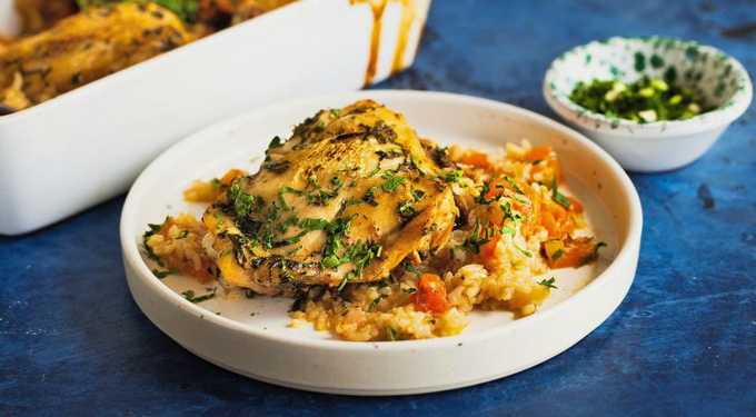 - Leg kippendijen op granen met groenten en stuur het gerecht 40 minuten naar de oven. Wij bakken op een temperatuur van 180 graden.