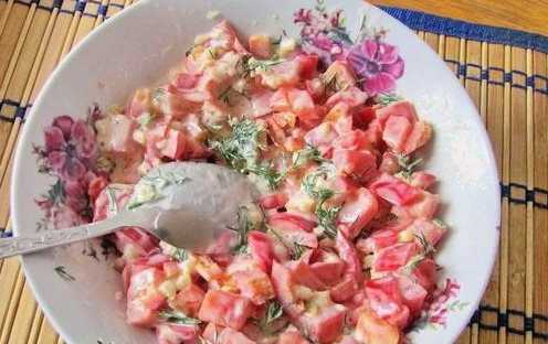 - Voeg gehakte knoflook en mayonaise toe aan tomaten met dille. Roeren.
