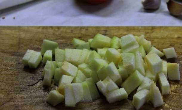 - Schil de courgette en snijd deze in kleine blokjes.