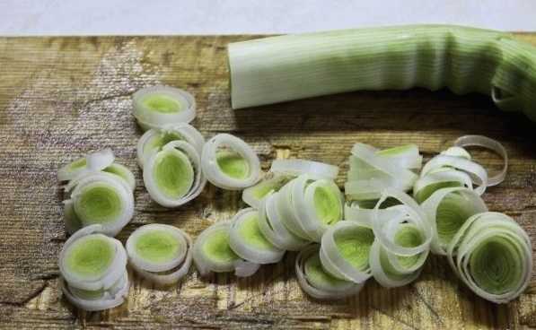- Snijd de prei in dunne ringen.