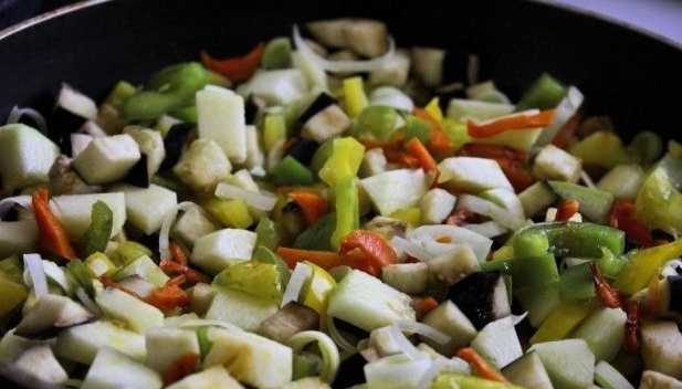 - Ook de gesneden groenten doen we in de pan. Voeg hier geweekte aubergine aan toe.We blijven stoven.