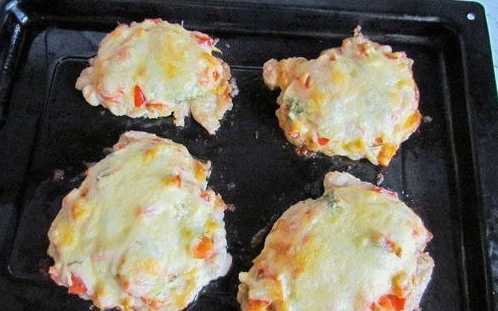 - We leggen het vlees op een bakplaat, waarop we de groentebereiding gelijkmatig verdelen.