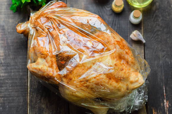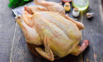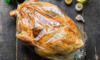 - Doe de voorbereide kip in een bakzak. We koken het gerecht anderhalf uur op een temperatuur van 180 graden.