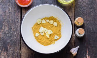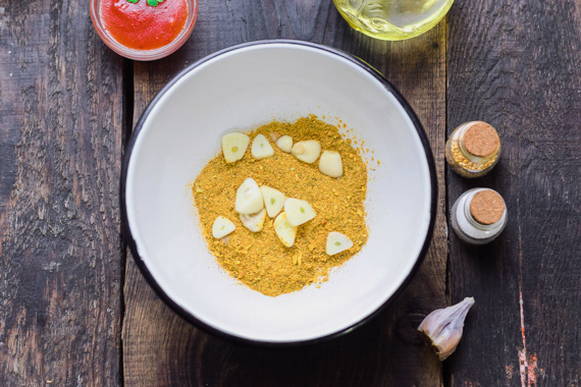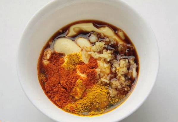 - Combineer sojasaus, mayonaise, zout, kerrie en paprikapoeder in een aparte kom. We sturen hier ook gehakte teentjes knoflook naar toe.