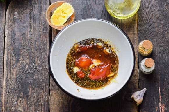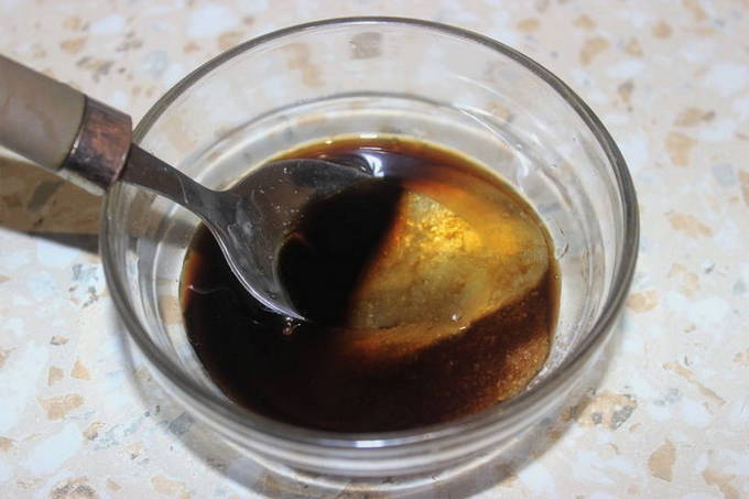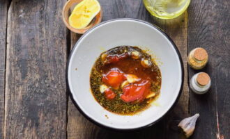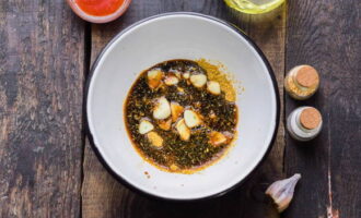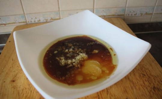 - Combineer sojasaus, gehakte knoflook, citroensap en een lepel honing in een bord. Kneed grondig.