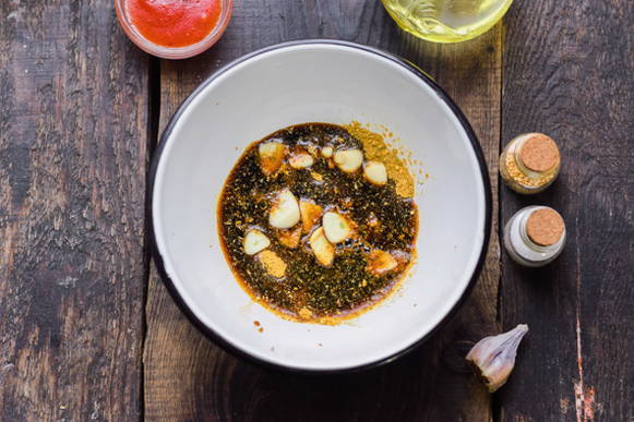 Giet de kipkruiden in een diepe sivka en voeg hier stukjes knoflookteen toe.