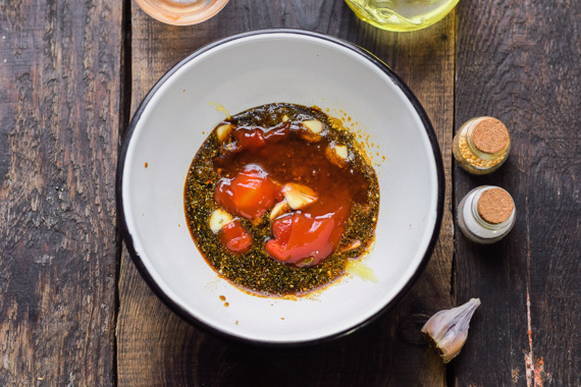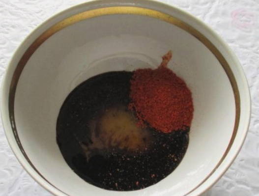 - Giet sojasaus in een diep bord. Voeg er honing en gemalen paprika aan toe.