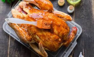 Bestrijk de kip met de voorbereide massa sojasaus. Gebruik hiervoor een siliconenborstel. We marineren ongeveer 1 uur.