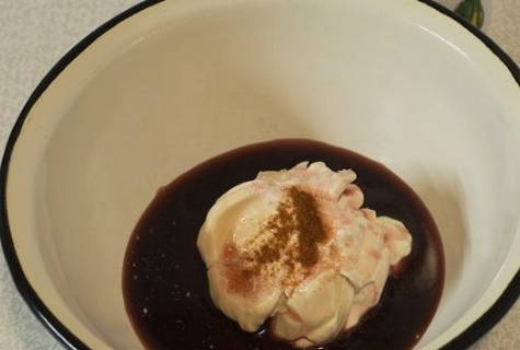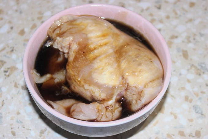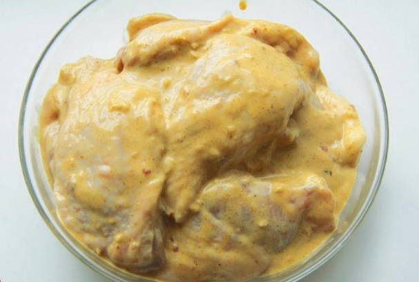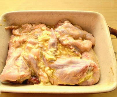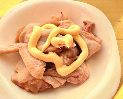 - Roer de kip door de bereide sojasaus en mayonaise marinade. We marineren ongeveer 1 uur.