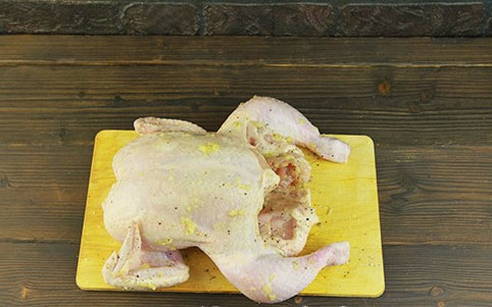 - Smeer het karkas in met plantaardige olie en wrijf het vervolgens in met zwarte peper en gehakte teentjes knoflook.