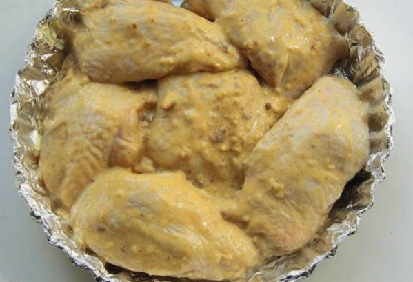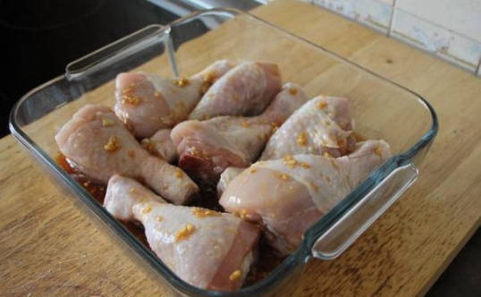 - Giet vervolgens over het product met soja-mosterdmarinade. Bind de kippenpoten vast met een draad. We marineren het werkstuk minimaal 1 uur.