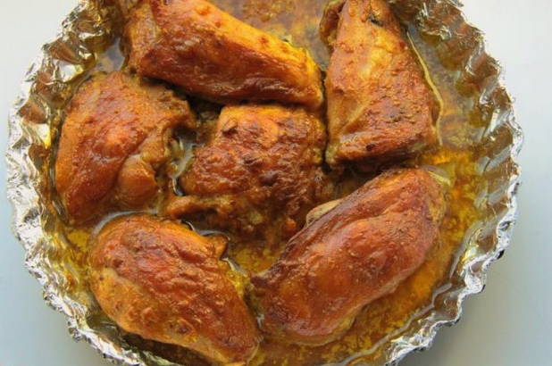 - Verwijder 15-20 minuten voordat u klaar bent de bovenste laag folie en laat de kip een rossige tint krijgen.