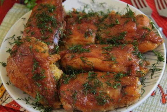 Voor een voedzaam en lekker diner voor twee, gemarineerde kipfilet met sojasaus en honing. Het in de oven gebakken gerecht zal u verrassen met zijn sappigheid en aroma.