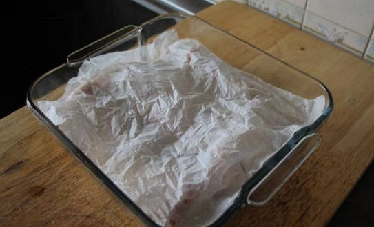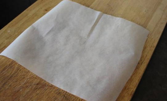 - Knip een vel papier dat in de ovenschaal past. We maken het papier nat met water.