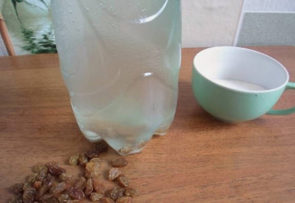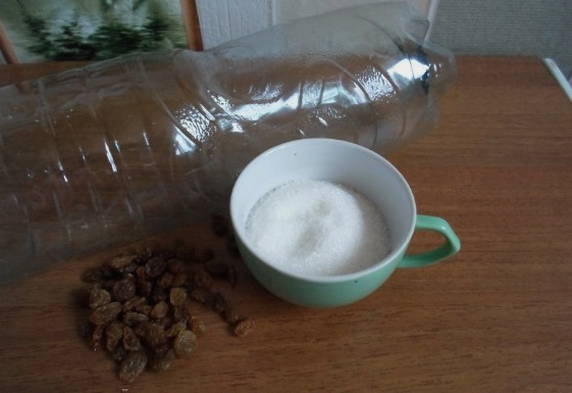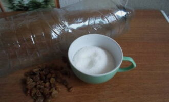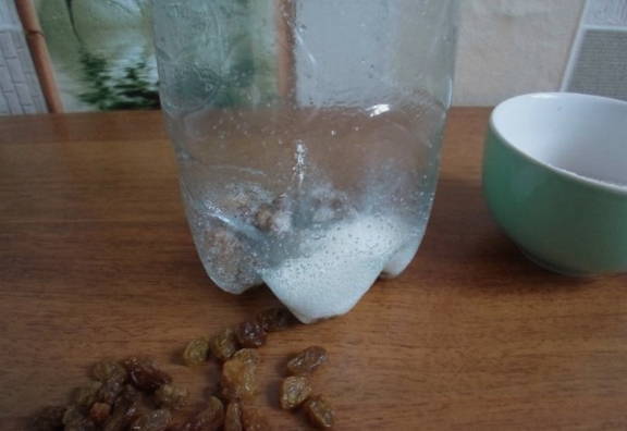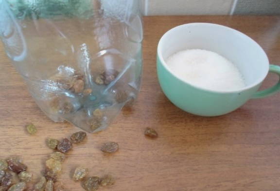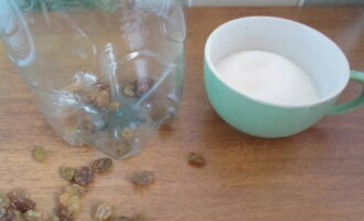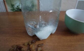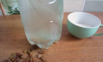 Giet de benodigde hoeveelheid suiker en rozijnen erbij. Een plastic fles voor het maken van kwas moet grondig worden gespoeld en verwijderd van vreemde geuren.