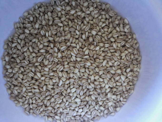 We sorteren de gerst en doen het in een hete koekenpan. Frituur het product tot het volledig donker is. Roer zodat het niet aanbrandt.