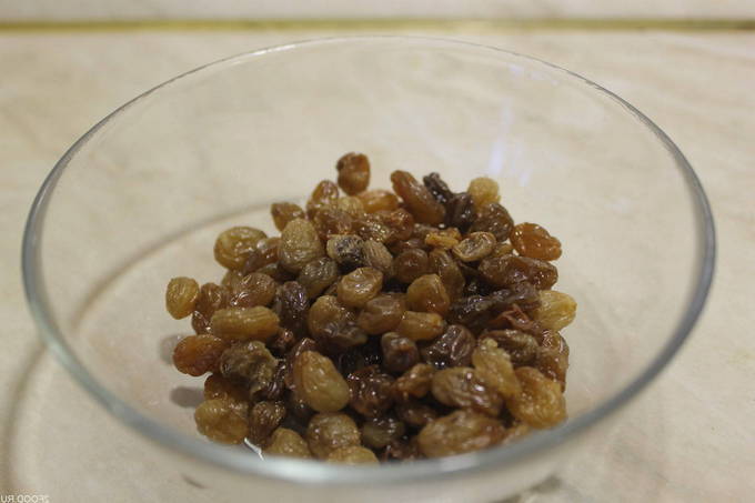 We sorteren en wassen de rozijnen. We leggen het product op een papieren handdoek en laten het drogen.