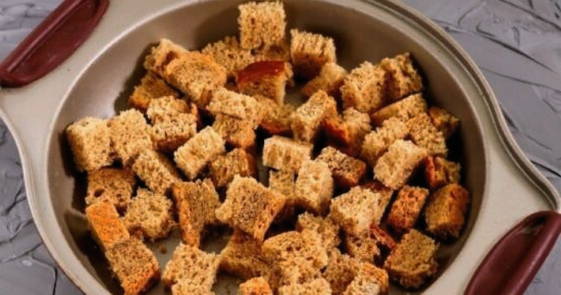 Snijd het roggebrood in blokjes. We leggen ze op een bakplaat en sturen ze 15 minuten naar een voorverwarmde oven op 180 graden.