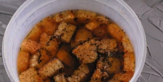 We combineren hete croutons, rozijnen en bereide vloeistof in een gemeenschappelijke container. U kunt een pot of plastic fles gebruiken. We sluiten het werkstuk en laten het 3 dagen op een warme plaats staan.