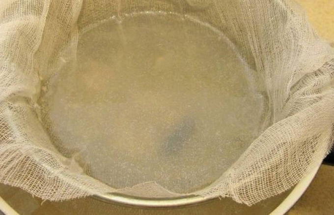 Vouw een groot stuk gaas 2-3 keer. We filteren berkensap door het materiaal. Indien nodig, dan meerdere keren.