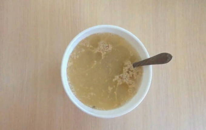 We filteren het berkensap van tevoren en vullen het met hete croutons in een pan. Laat de inhoud afkoelen tot een temperatuur van 30 graden.
