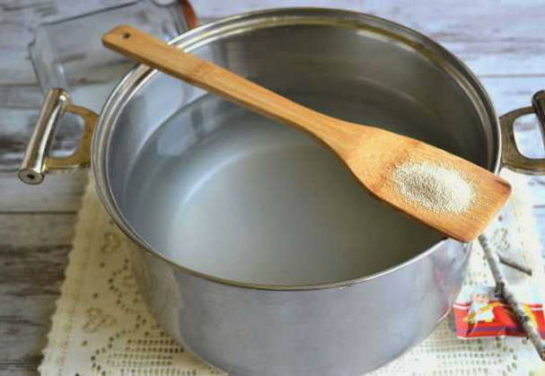 We verdunnen droge gist in een kleine hoeveelheid warm water. Gebruik niet heet.