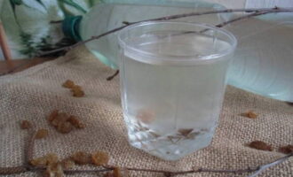 Gedurende deze tijd kunt u een handvol rozijnen afspoelen en drogen. We gooien bedorven fruit weg, ze kunnen de smaak van de afgewerkte drank beïnvloeden.