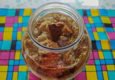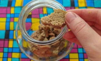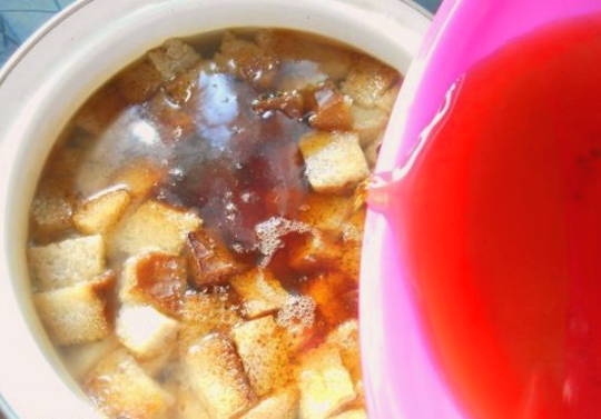 - Kook water en laat afkoelen tot kamertemperatuur. Daarna dompelen we de bruine broodkruimels in een pot en vullen ze meteen met water.