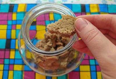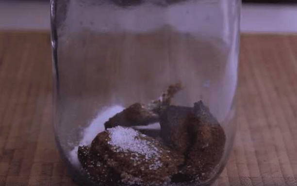 - Daarna sturen we het brood naar een schone en droge glazen pot. Ook voegen we hier suiker en roggemout toe. Het hoeft niet vooraf te worden geweekt.