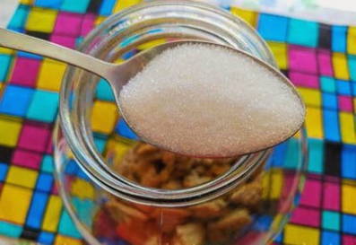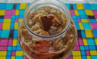 - We doen het product samen met suiker in een glazen pot. Vul het voedsel met warm gekookt water.