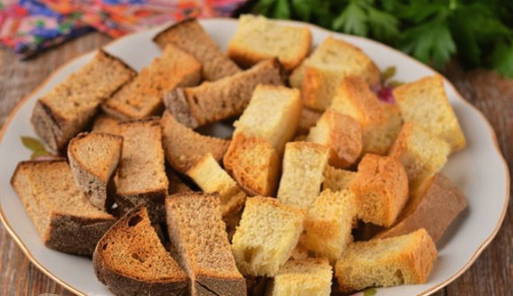 - Snijd zwart brood in kleine sneetjes of blokjes. Leg het product vervolgens op een bakplaat en droog het 10 minuten in de meest voorverwarmde oven.