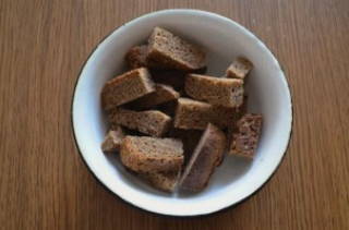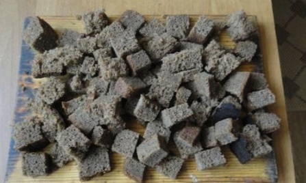 - Snijd sneetjes Borodinobrood in kleine stukjes en droog ze af. Je kunt het product vooraf op de vensterbank leggen of 5-10 minuten in de oven zetten.