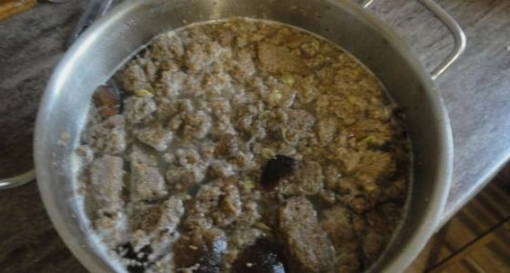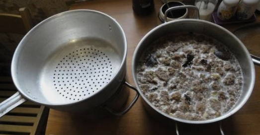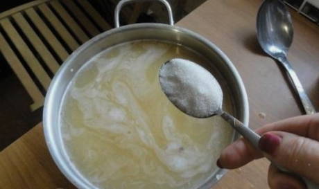 - Kook water en laat afkoelen tot ongeveer 40 graden. Giet de vloeistof in een pan met de inhoud.