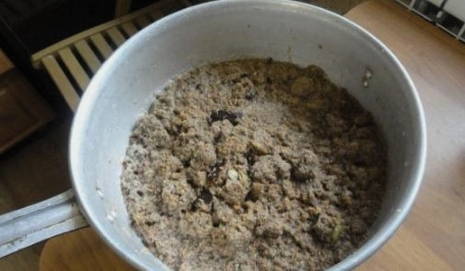 - Doe de resulterende crackers in een grote pan. Hier voegen we ook rozijnen, suiker en droge gist aan toe.