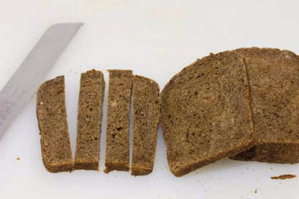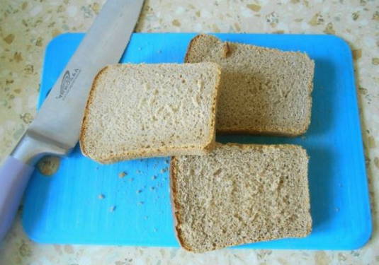- Snijd drie sneetjes middeldik bruin brood af.