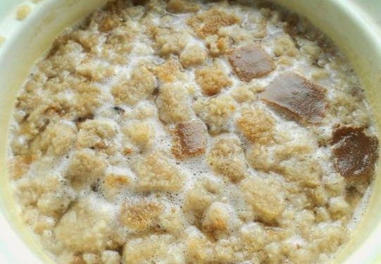- Voeg een lepel suiker en een liter kokend water toe aan het broodproduct.