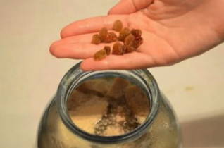 - Voeg na 15 minuten 2 liter afgekoeld gekookt water toe en voeg de helft van de totale hoeveelheid rozijnen toe. Giet kwasgist in.