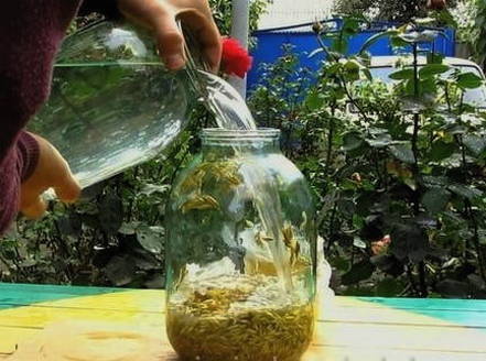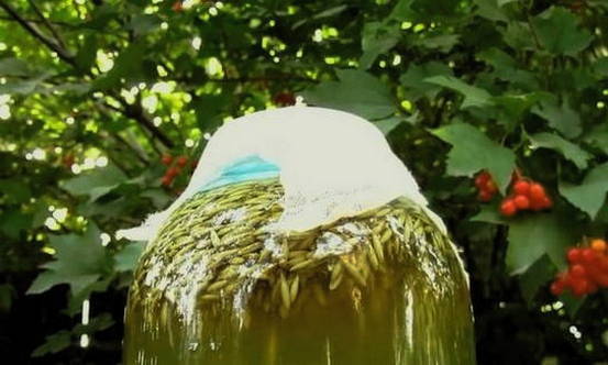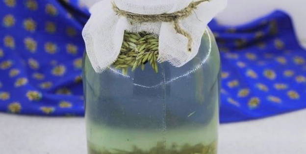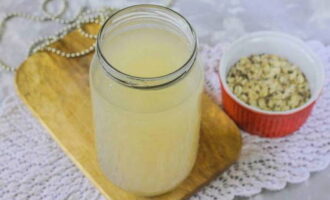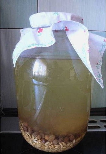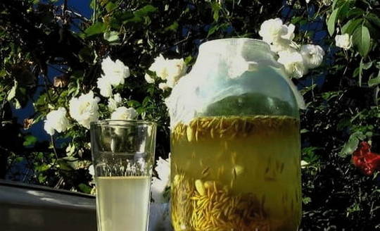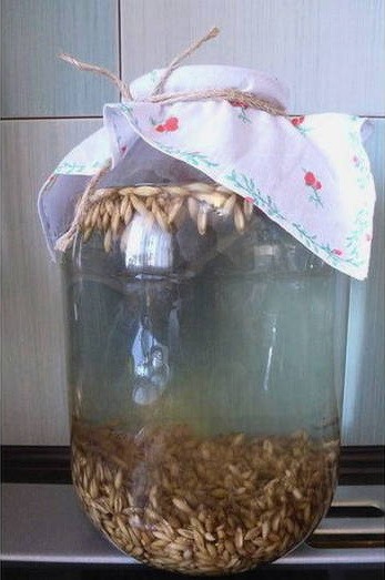 - We laten het doordrenkte water weglopen en laten de haver achter. Vul de resulterende startercultuur met water, voeg vervolgens honing met fructoseresten toe, meng grondig, dek de pot af met gaas en laat een dag op een warme plaats staan.