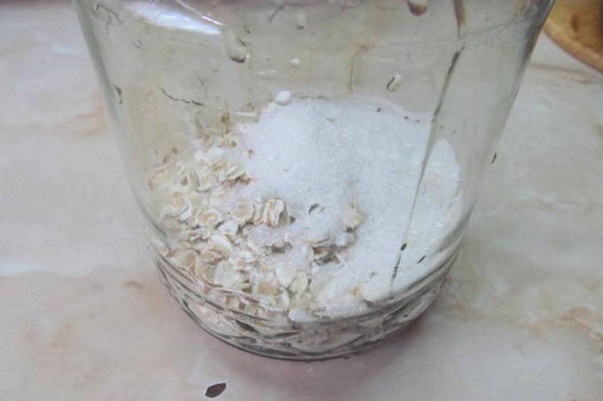 - Giet de havermout in een pot en voeg suiker toe, waardoor de vloeistof begint te gisten.