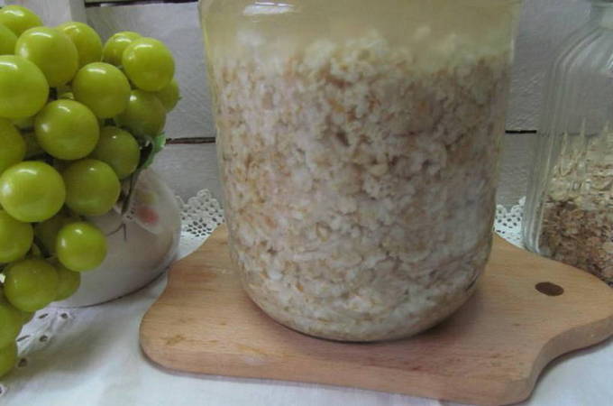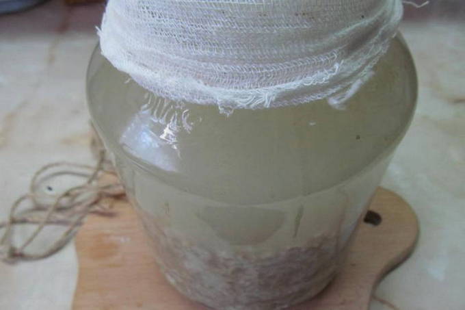 - We doen haver en honing in een pot, vullen ze met water en laten een beetje ruimte over. Dek af met gaas en laat ongeveer 3 dagen staan. Giet het eerste kwas af, vul het zuurdeeg met water, voeg honing toe en laat een dag staan.
