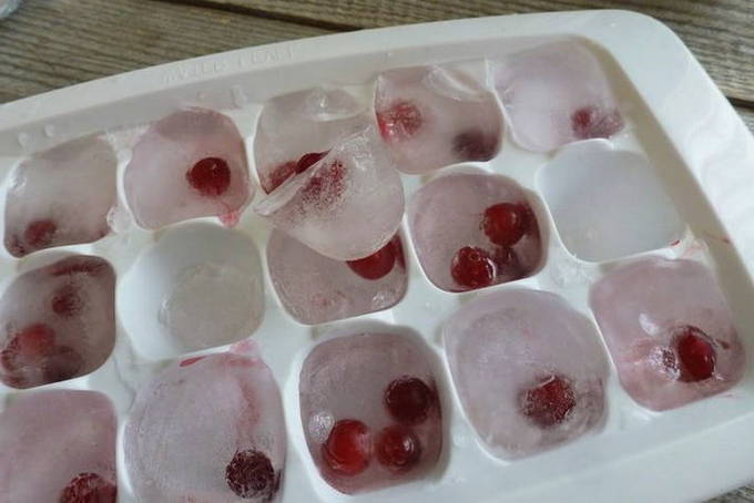 - Om het kwas niet alleen lekker, maar ook mooi te maken, bevriezen we verschillende ijsblokjes met bessen erin.