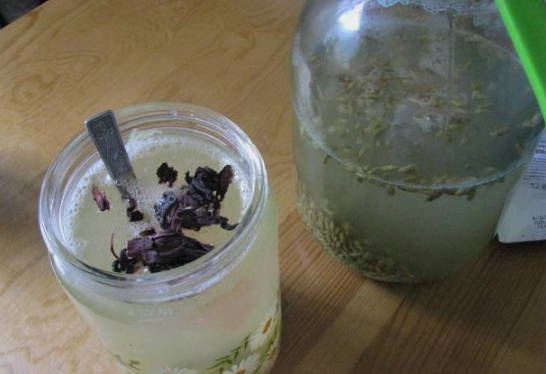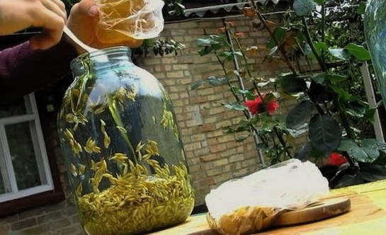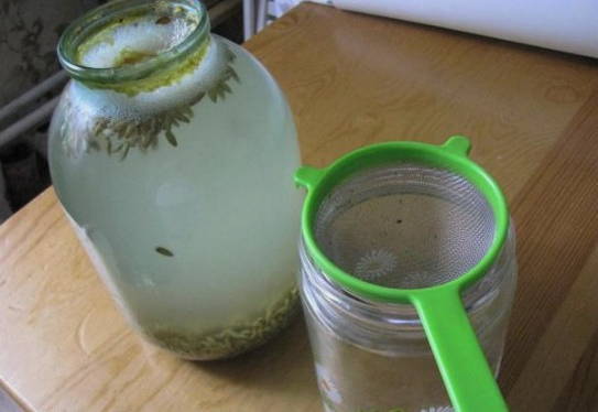 Haal na 2 uur de pan eruit en laat de vloeistof afkoelen tot kamertemperatuur. Voeg gist met honing toe aan het afgekoelde kwas, meng alle ingrediënten. We zetten het mengsel op een warme plaats en laten het 3 dagen trekken.