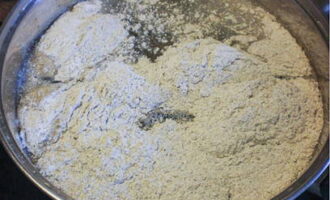 - Roer constant en bak de bloem tot deze beige en romig wordt. Dit proces gaat gepaard met een popcornachtige geur. Het braadproces duurt gemiddeld 5-10 minuten. Je kunt het langer vasthouden als je een donkerder en rijker kwas wilt krijgen, maar in dit geval is het beter om het vuur een beetje te verlagen zodat de bloem niet gaat branden en als gevolg daarvan erg bitter smaakt.