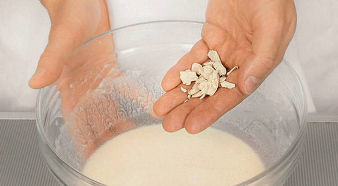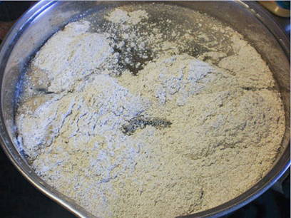 - Giet de bloem in een diepe kom en bedek met een beetje warm water.