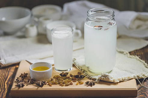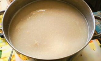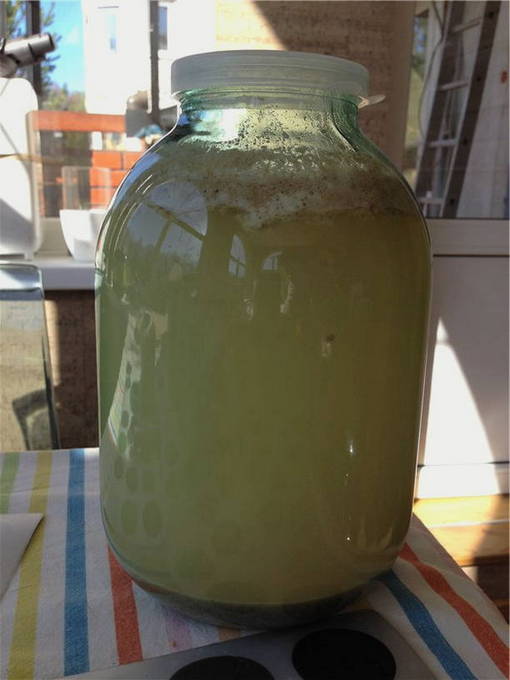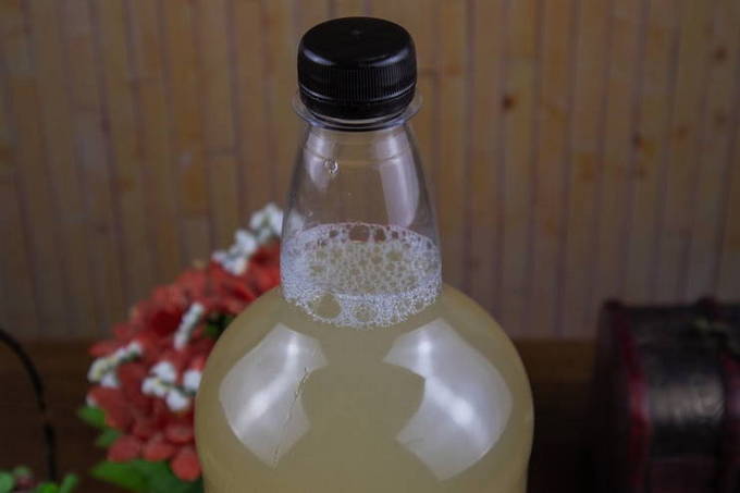 - Giet de resulterende vloeistof in een pot van drie liter, voeg daar gist, rozijnen en 80 gram suiker toe, meng alles grondig. Voeg water toe tot bijna aan de bovenkant van de pot, meng alles opnieuw en sluit af met een plastic deksel of met gaas dat in meerdere lagen is gevouwen. Deze vloeistof moet binnen 24 uur rijpen.
