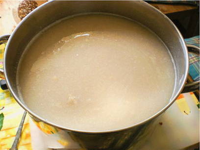 - Haal na een tijdje het wort uit de oven en laat afkoelen tot 40 graden. Voeg er nog 1 liter water van dezelfde temperatuur, giststartercultuur aan toe en meng alles goed. Laat 24 uur fermenteren.
